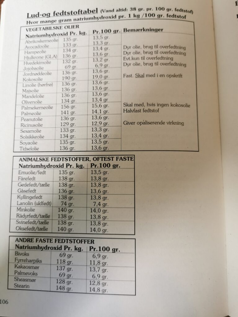 Du kan bruge alle mulige slags olier. Hvor meget kaustisk soda, der skal bruges, kommer an på, hvilken olie du anvender. Hvis du selv vil sammensætte sæbeopskrifter, kommer herunder en oversigt over udregninger i forhold til forskellige olier. Oversigten kommer fra Sæbe Kogebogen af Sumo Lotus (Mette Lotus), som jeg har refereret til tidligere. Oversigten er bragt med tilladelse fra Mette. Jeg vil anbefale at købe eller låne bogen på biblioteket. I ældre udgaver af bogen bruges der piskeris til at lave sæberne, men det er betydeligt nemmer at lave dem med stavblender, som jeg har beskrevet i opskriften.